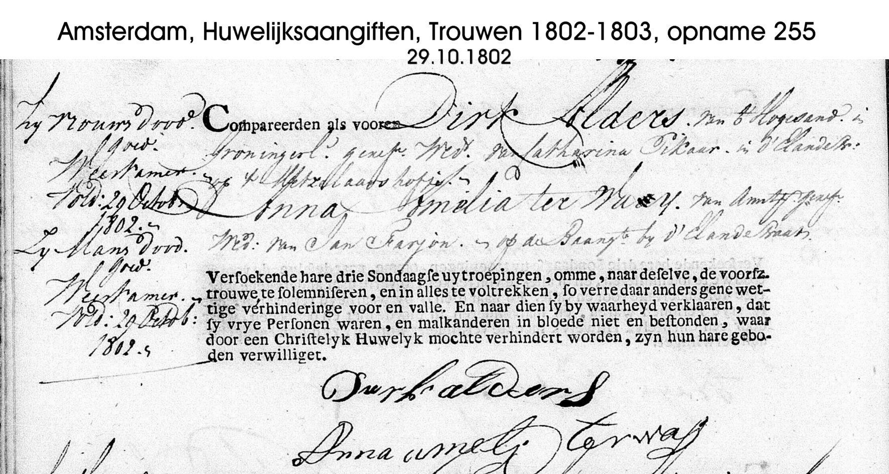 Ihr zweiter Ehemann, Dirk Alders, kommt von Hoogezand in dem Groninger Land. Anna verlangt hier, dass ihr Familienname mit einem a geschrieben wird, obwohl der in der Taufakte mit zwei a steht: