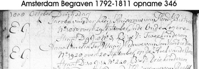 Anna Amelia stirbt am 28.09.1808 in Amsterdam. Jan David Farjon wird hier "Jan van der Waaij" genannt, woran man erkennt, dass die Anzeige durch die mündliche Mitteilung oft falsch über kam: