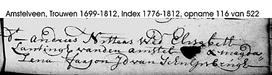 „Andries Nitters van A. oud 21 jaar woont onder het gebied van Amstelveen, ouders doot, geast. met zijn voogd Johannes Koop de Rato Caver ende van sijn mede voogt Willem Berveling, en Elisabet Lanting van A: oud 27 jaar woont buiten de Utregtsepoort geast. met haar moeder Elisabet Cornelis“