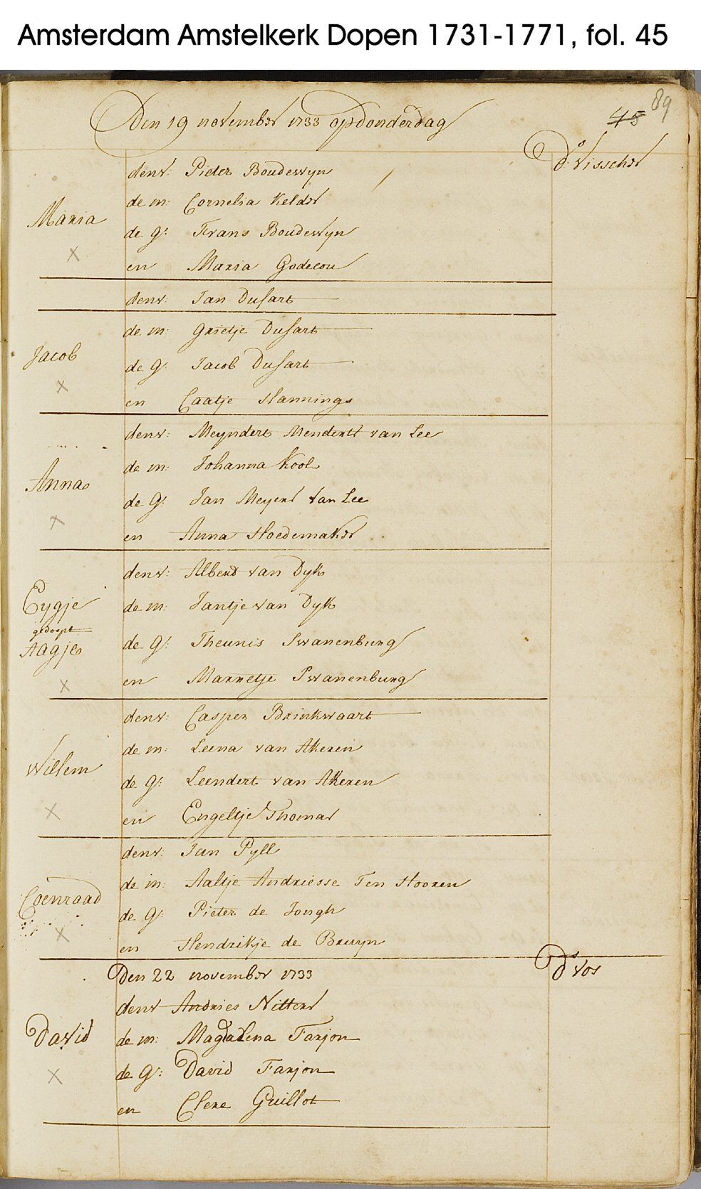 Es gibt einen Taufeintrag vom 07.10.1789 aus Amsterdam, worin Patricus Wilhelmus Davidson und Magdalena Farjon als Zeugen genannt werden: