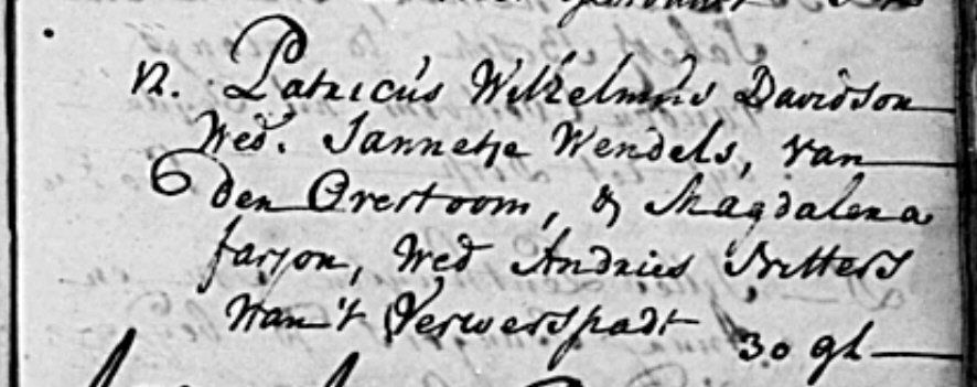 Die Frage ist, wer die Taufpaten Patrikus Wilhelmus Davidson und Magdalena Farjon aus 1789 sind.