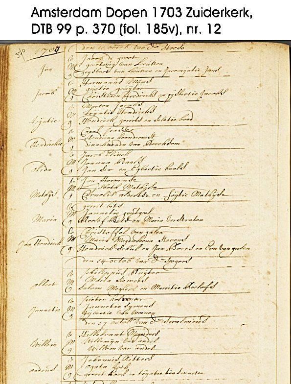 Andries ist wahrscheinlich um den 10. Oktober 1703 in Amsterdam geboren und am 17. Oktober 1703 in Amsterdam getauft:
