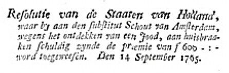 "Resolution der Staaten van Holland, wobei an den substitut Schout von Amsterdam, wegen der Entdeckung eines Juden, an Einbrüchen schuldig, die Gratifikation von f 600,- zugewiesen wurde . Den 14. September 1765.
