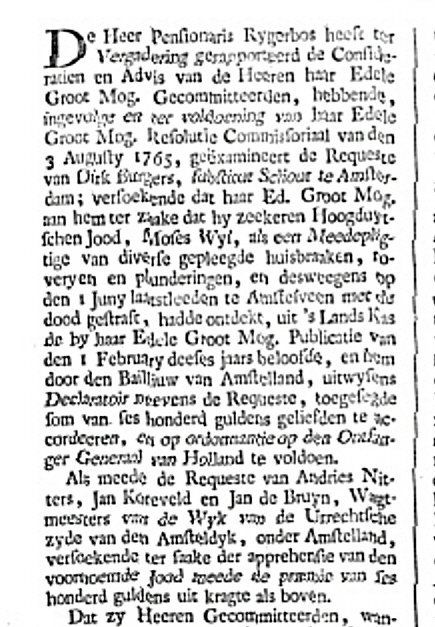 Der Herr Pensionaris Reigerbos hat zur Begleichung rapportiert die Concideratien und Advis der Herren ihre Edele Groot Mog. Kommittierten, habend, infolge und zur Ausführung von ihrer Edele Groot Mog. Resolution Commissorial vom 3. August 1765, examiniert das Request von Dirk Burgers, substitut Schout in Amsterdam; bittende dass ihr Ed. Groot Mog. an ihn in der Sache dass er den gewissen hochdeutschen Juden, Moses Wyl, als ein Mittäter bei diversen begangenen Einbrüchen,Räubereien und Plünderungen, und deswegen am 1. Juni in Amstelveen mit dem Tode bestraft, hatte entdeckt, aus der Landeskasse die in ihrer Edele Groot Mog. Publication des 1. Februar dieses Jahres ausgelobte, und ihm durch den Baljuw von Amstelland, wie ersichtlich aus der Deklamation nebst dem Requeste, zugesagte Summe von sechs hundert Guldens zu erteilen, und auf Anordnung vom Ontfanger Generaal von Holland zu vollstrecken.