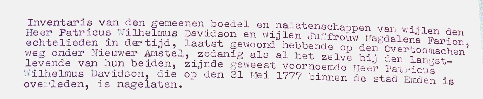 "Inventar von dem Hausrat und dem Nachlass von dem verstorbene Herrn Patricus Wilhelm Davidson und der verstorbenen Frau Magdalena Farjon, zuletzt eheleute, zuletzt wohnende an der Overtoomsche Weg unter Nieuwer Amstel, in dem Sinne, dass alles von dem Längstlebenden der beiden, das heißt vom vorgenannten Herrn Patricus Wilhelmus Davidson, der am 31. Mai 1777 in der Stadt Emden verstorben ist, nachgelassen wurde."