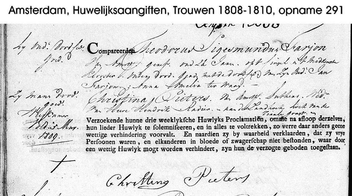 Am 03.05.1809 (14. "grasmaand") heiratet er Christina Pieters. Aus dem Randnotiz geht hervor, dass seine Eltern beide schon gestorben sind und dass Christina Pieters schon einmal verheiratet war. Teodorus Ziggemundus kann nicht schreiben, er macht ein Kreuz unter der Akte.