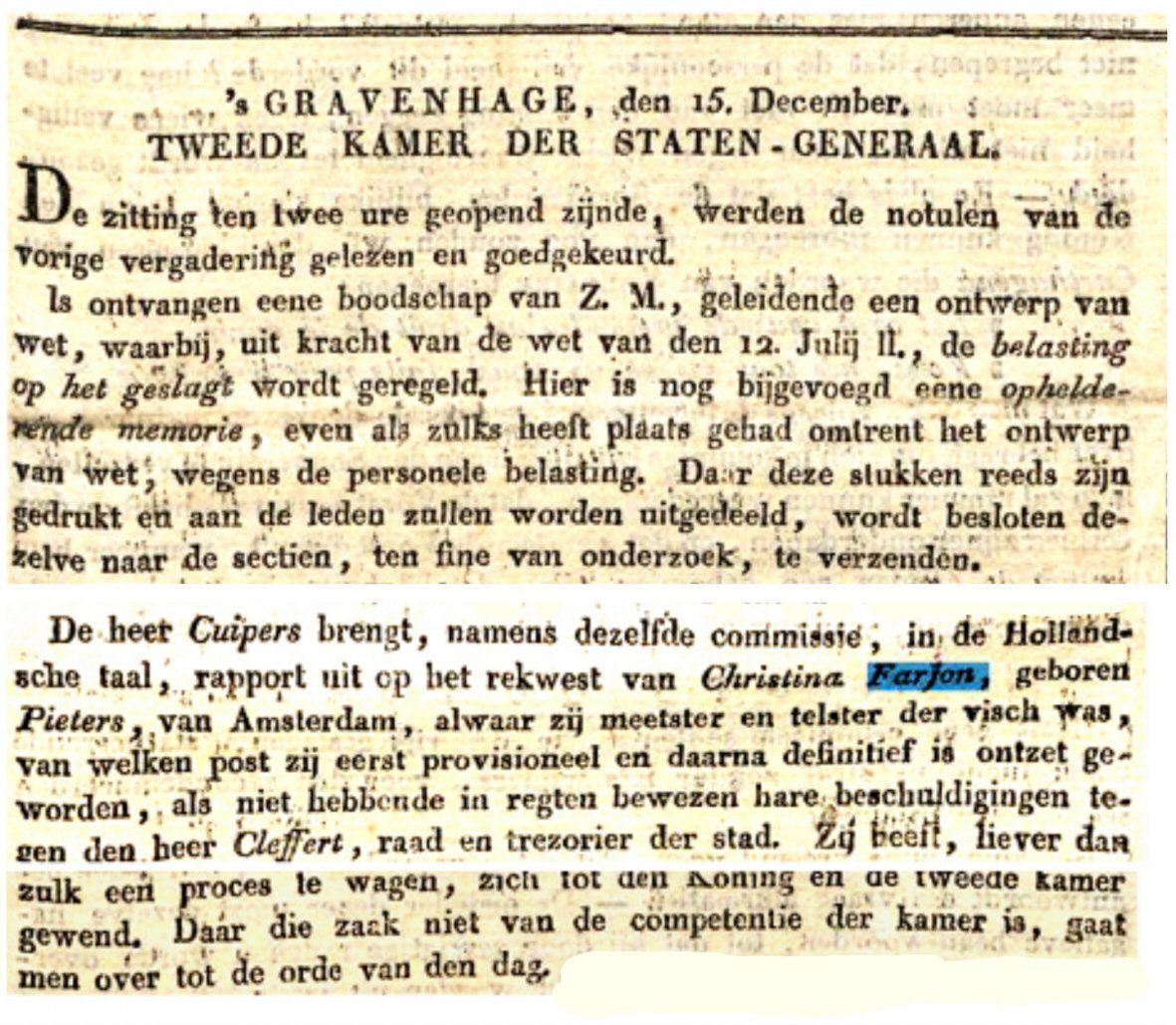 Aus dem weiteren Leben von Teodorus Ziggemundus wissen wir nichts und auch das Sterbedatum ist unbekannt. Christina Pieters reicht einen Appell ein beim König und der Tweede Kamer, weil sie meint zu Unrecht entlassen zu sein. Sie ist „meetster, weegster en telster van den visch“ gewesen. In dieser Tätigkeit musste sie die Anlieferung von Fisch kontrollieren: