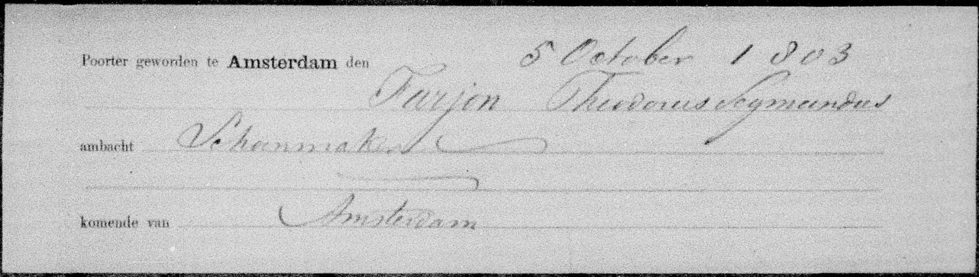 1803 wurde Teodorus Ziggemundus im Alter von achtzehn Jahren als "poorter" der Stadt Amsterdam eingeschrieben (Fiche Wallonne):